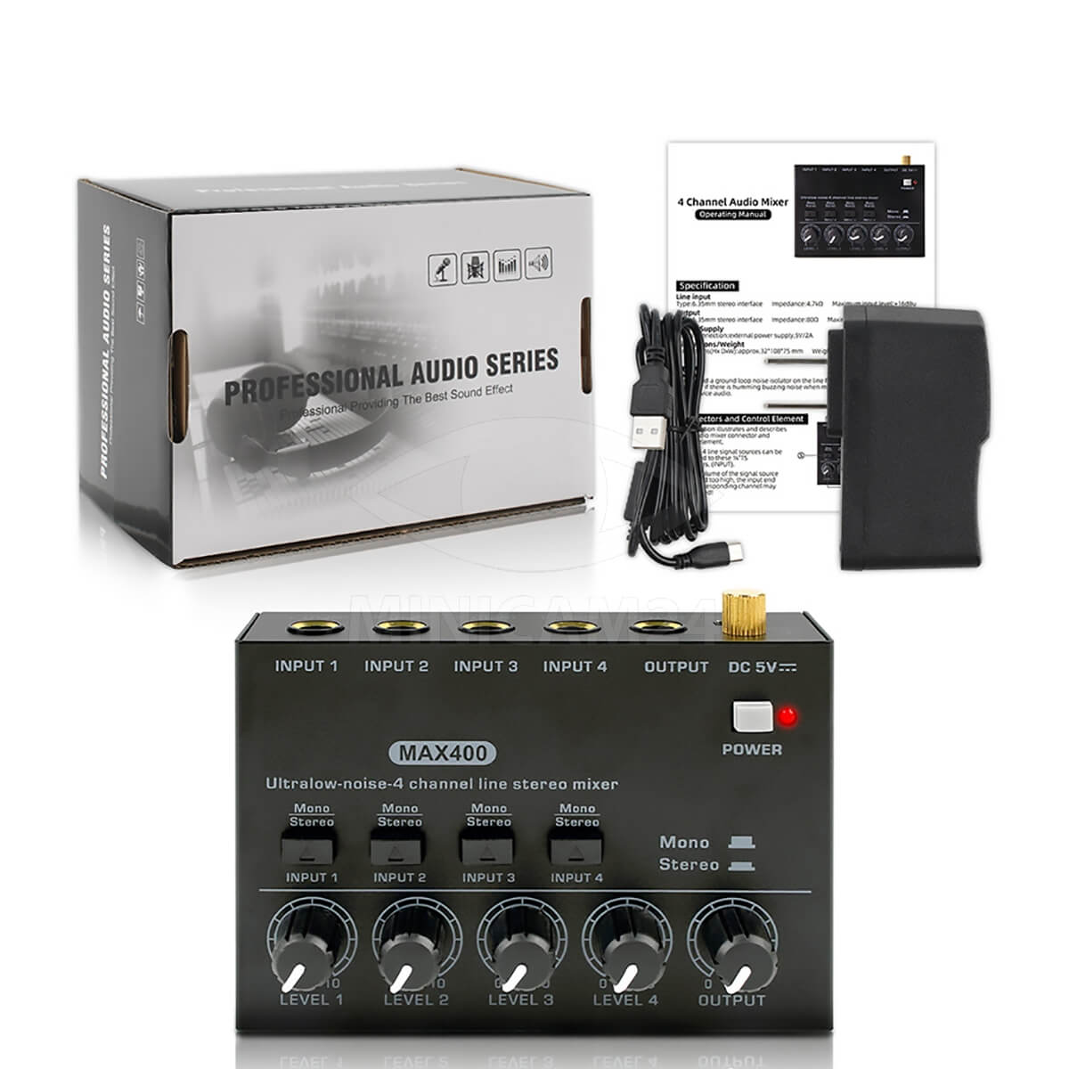 Это стереофонический 4-канальный микшер, позволяющий микшировать микрофон, гитару, бас, клавишные, электронные барабаны и т. д.
